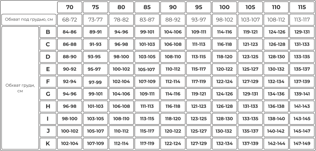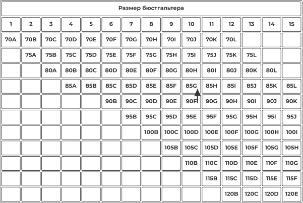 ПЕРЕД ВАМИ ТАБЛИЦА, КОТОРАЯ ПОМОЖЕТ ПОДОБРАТЬ ПРАВИЛЬНЫЙ РАЗМЕР БЮСТГАЛЬТЕРА С УЧЕТОМ УМЕНЬШЕНИЯ ОБЪЕМА ПОЯСА. Если размер бюстгальтера выбран правильно, то пояс должен сидеть достаточно плотно. Чаще всего женщины выбирают объем пояса несколько больше, чем это необходимо. Они полагают, что так комфортнее, легче дышать или боятся, что проявятся складочки на спине. На самом деле более свободный пояс приводит к обратному эффекту: он не фиксируется должным образом на спине, из-за этого при носке перемещается вверх и создает те самые складки, а дискомфорт при дыхании чаще всего связан не с поясом, а с неправильно расположенными косточками из-за слишком маленькой чашечки бюстгальтера. Например, чашечка 70D и 95D — это не одна и та же чашечка, где отличается только размер пояса! Нельзя подгонять грудь под мифические размеры 1, 2, 3… Размер чашечки (буква), без учета объема пояса, не скажет ровным счетом ничего. 70D — визуально небольшой объем груди, потому что 70 — это маленький объем пояса. 95D — большая грудь, так как 95 — это большой объем пояса. ВАЖНО! Также распространенной ошибкой является то, что пояс бюстгальтера должен фиксироваться в зоне лопаток. Но исследования показали: чтобы избежать самопроизвольного движения бюстгальтера по спине, пояс должен фиксироваться в самом узком месте спины, а именно в промежутке между лопатками и талией параллельно полу. ВАЖНО! Приобретая бюстгальтер с поясом на размер меньше (более плотный), необходимо выбирать чашку соответственно на размер больше. Если вы хотите, чтобы пояс сидел более плотно, и при этом оставить корректную полноту чашечки, нужно выбрать размер чашечки на один пункт выше по вертикали в этом же столбце. Например, размеру 90F с более плотным поясом соответствует размер 85G. Полнота чашечки у 90F и 85G будет одинаковой.